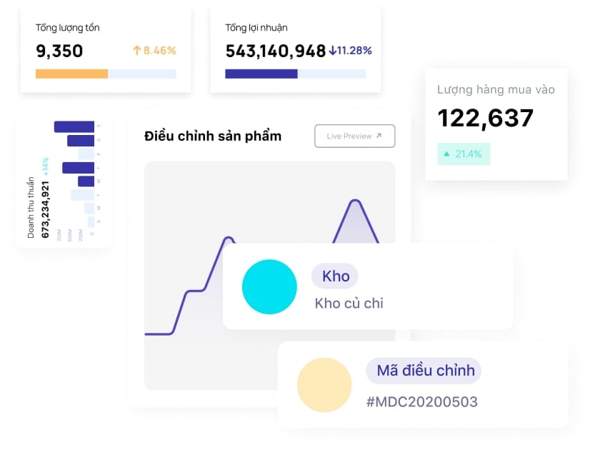 Quản lý số lượng, mã hàng, biến thể sản phẩm… chi tiết đến từng kho hàng.